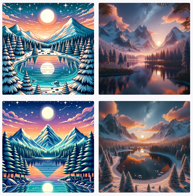 - Prompt: “Un paisaje montañoso cubierto de nieve al atardecer, con un lago cristalino en primer plano reflejando el cielo anaranjado. Árboles de hoja perenne bordean el lago, y el cielo está lleno de estrellas y una luna creciente, estilo digital art, alta resolución.”