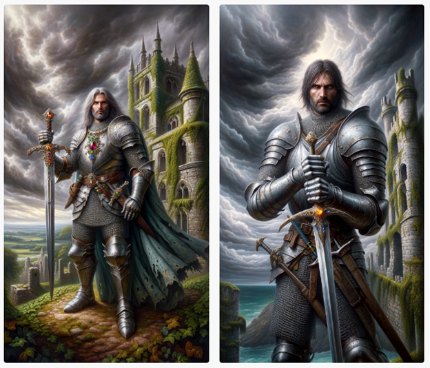 - Prompt: “Un guerrero medieval con armadura completa de acero envejecido, sosteniendo una espada de doble filo con incrustaciones de piedras preciosas. Está de pie frente a un castillo en ruinas cubierto de enredaderas, con un cielo tormentoso detrás, estilo de pintura al óleo, hiperrealista.”