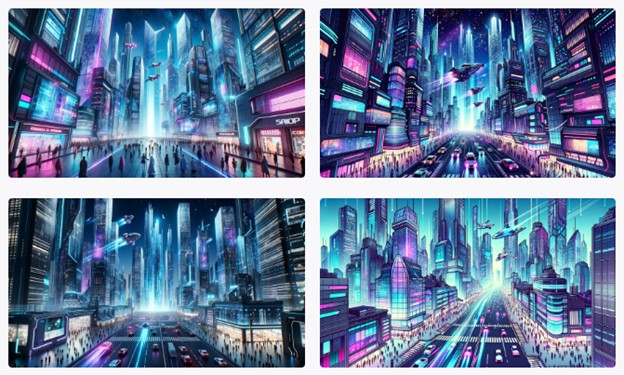 - Prompt: “Una ciudad futurista con rascacielos de cristal y metal, iluminados con luces de neón en tonos azules y púrpuras. Coches voladores cruzan el cielo estrellado. Personas con ropa futurista caminan por las calles llenas de hologramas publicitarios, estilo cyberpunk, alta resolución y detallado.”